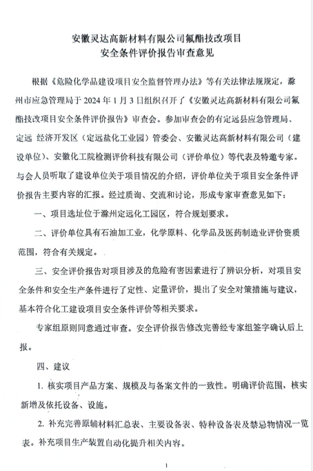 安徽灵达高新材料有限公司氟酯技改项目安全条件评价