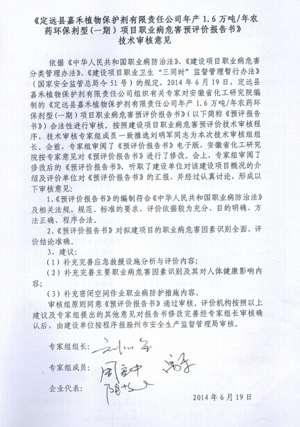 定远县嘉禾植物保护剂有限责任公司1.6万吨/年农药环保剂型项目职业病危害预评价