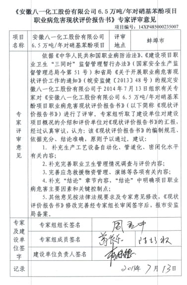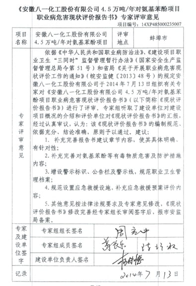 安徽八一化工股份有限公司职业病危害现状评价