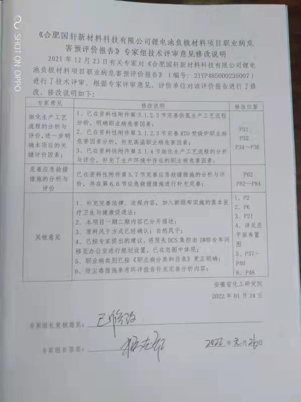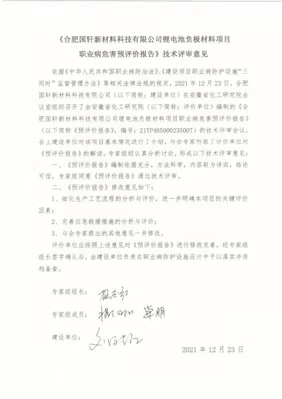 合肥国轩新材料科技有限公司锂电池负极材料项目职业病危害预评价