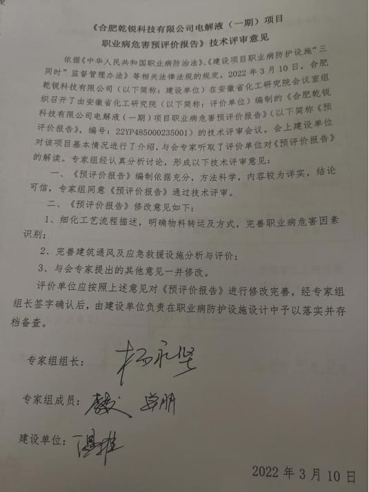合肥乾锐科技有限公司电解液(一期)项目职业病危害预评价